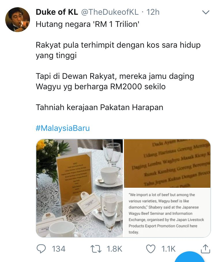 Seorang pengguna Twitter @TheDukeofKL tampil mempersoalkan sajian mewah itu yang dihidangkan di saat kerajaan Pakatan Harapan mendakwa negara berdepan bebanan hutang mencecah RM1 trilion.