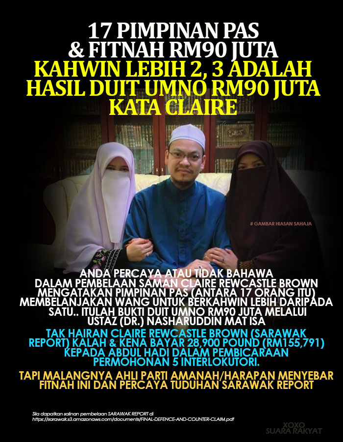 Beberapa pemimpin PAS yang lain didakwa membeli rumah, kereta mewah dan berkahwin dua, tiga; mereka membelanjakan wang secara bermewahan melebihi dari gaji mereka.Nak percaya atau tidak itu yang mereka tulis dalam penghujahan 55 muka surat. Jadi tak hairanlah Sarawak Report diperintah membayar keseluruhan kos 28,900 pound (RM155,791).