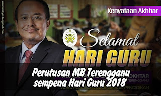 Saya mengambil kesempatan untuk mengucapkan Selamat Hari Guru kepada semua warga pendidik khususnya di Negeri Terengganu.