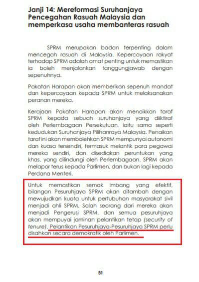 Pada manifesto Harapan menegaskan untuk memastikan semak imbang yang efektif, bilangan Pesuruhjaya SPRM akan ditambah dengan mewujudkan kuota untuk pertubuhan masyarakat sivil