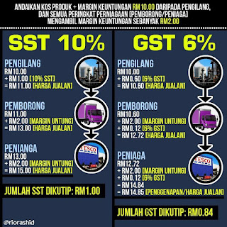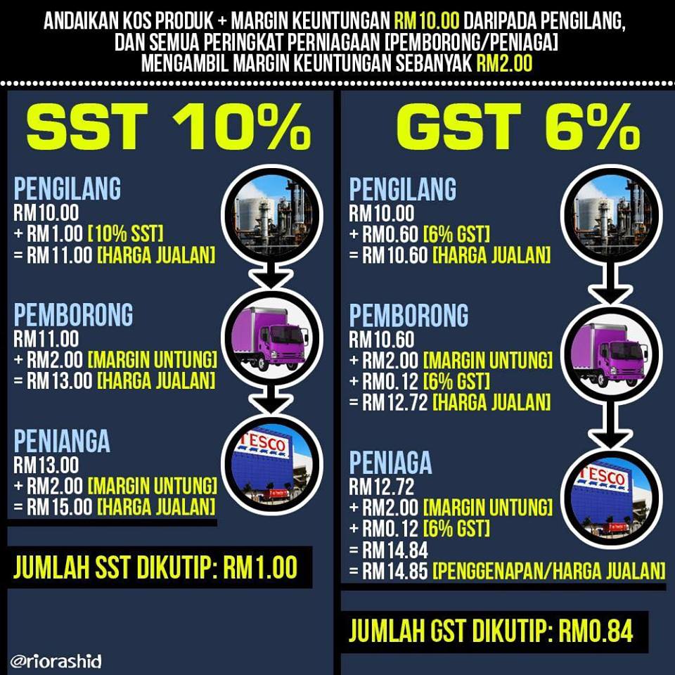 Perhatikan visual di di atas;1. Walaupun SST 10% hanya dikenakan di peringkat pengilang, HARGA JUALAN kepada pengguna akan menjadi LEBIH MAHAL [RM15.00] berbanding kutipan 6% GST di setiap peringkat perniagaan [RM14.85]. Ini kerana SST dikira terus berdasarkan harga produk sedangkan GST hanya dikira berdasarkan margin keuntungan [VALUE ADDED] yang diambil dalam setiap peringkat perniagaan.