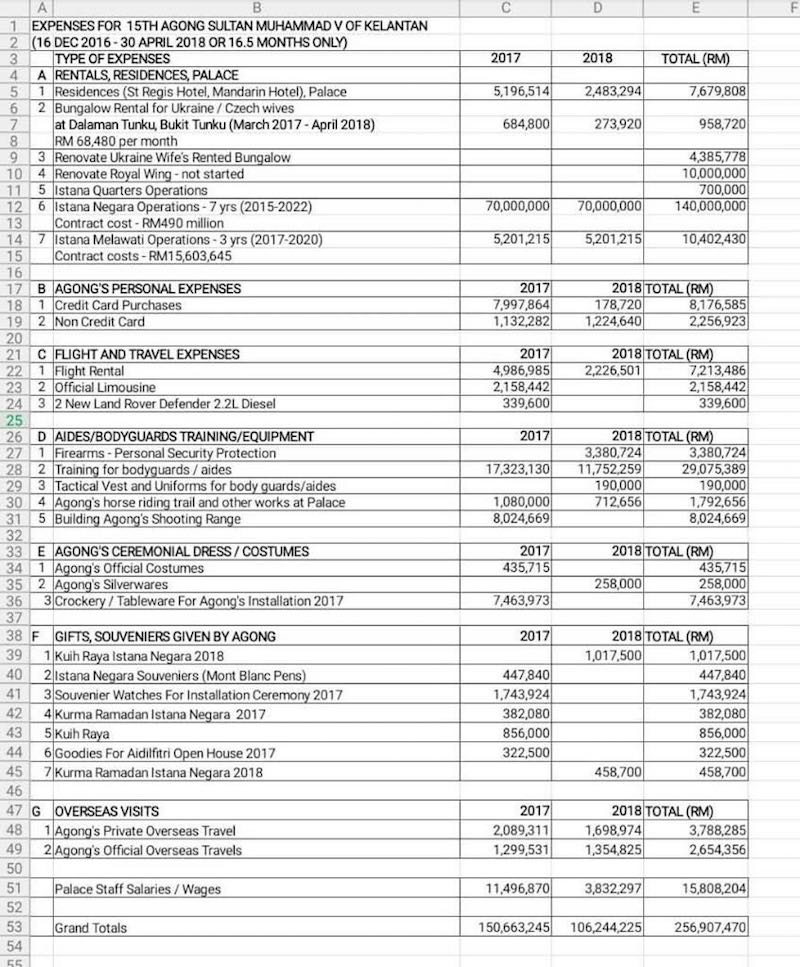 Kemudian kita pula disajikan dengan 'skrin capture' spreadsheet Microsoft Exel dengan perincian perbelanjaan Yang di-Pertuan Agong melalui WhatsApp, Telegram, facebook dan We Chat, seperti yang katakan oleh A. Kadir Jasin, kini semacam "tukang canang" Pakatan Harapan. Mengikut sebaran itu, dalam tempoh hanya 16 bulan, sejumlah RM256, 907, 470 telah dibelanjakan oleh Sultan Muhammad V dari Kelantan untuk pelbagai tujuan termasuk perjalanan persendiriannya di luar negara.