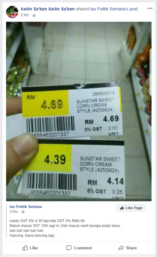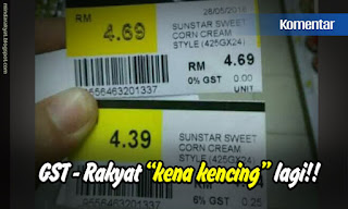Waktu ada GST 6% harga Sunstar Sweet Corn Cream ialah RM4.39 tapi bila kerajaan PAKATAN HARAPAN mengistiharkan GST 0% harga menjadi RM4.69. Belum masuk SST 10% lagi ni..Dah masuk nanti berapa pulak kena... kah kah kah kah kah.. Hancing..Kena kencing lagi..