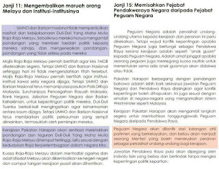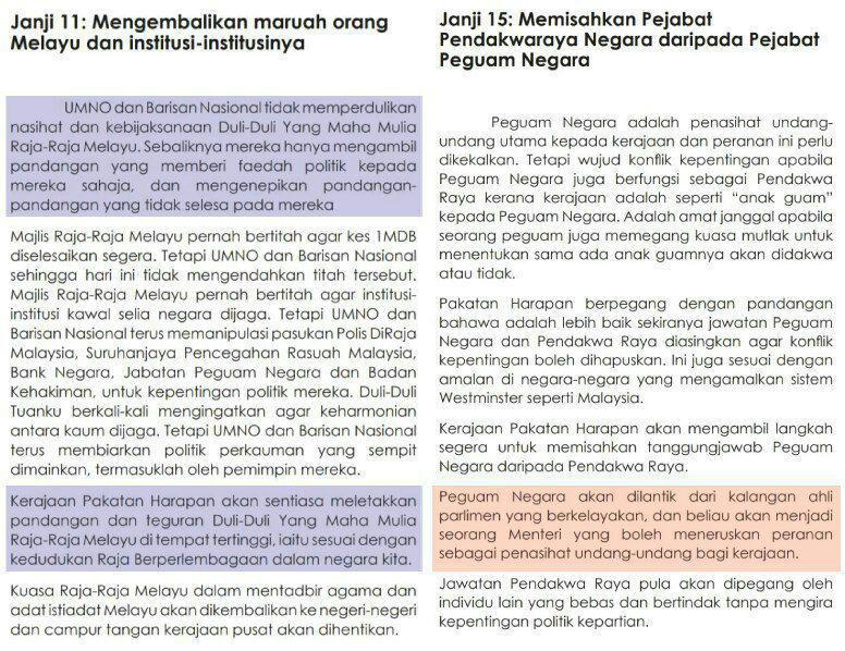 BalasPadam"Kerajaan Pakatan Harapan akan sentiasa meletakkan pandangan dan teguran Duli-Duli Yang Maha Mulia Raja-Raja Melayu di tempat tertinggi, iaitu sesuai dengan kedudukan Raja Berperlembagaan dalam negara kita. Kuasa Raja-Raja Melayu dalam mentadbir agama dan adat istiadat Melayu akan dikembalikan ke negeri-negeri dan campur tangan kerajaan pusat akan dihentikan".