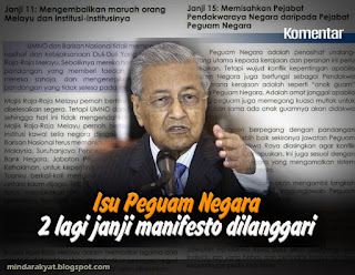 Daripada kenyataan Tun Mahathir tersebut 2 janji manifesto Pakatan Harapan telah dilanggari iaitu Janji 11 dan Janji 15.