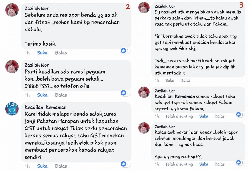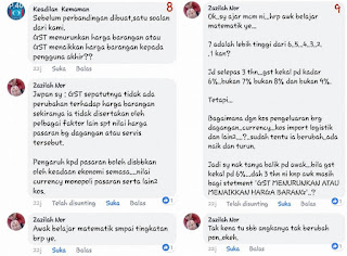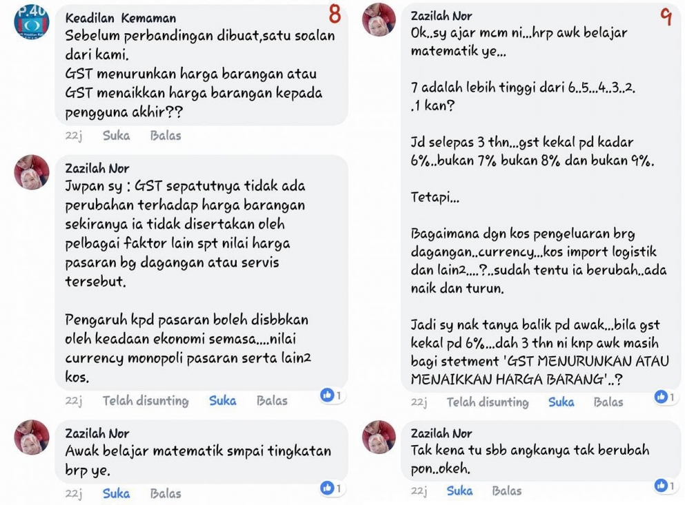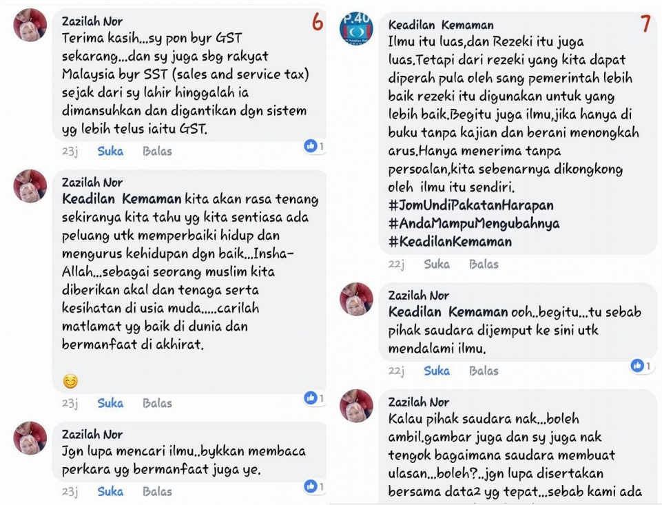 “Jadi saya nak tanya balik pada awak, bila GST kekal pada 6 peratus, sudah tiga tahun ini kenapa bagi statement ‘GST menurunkan atau manaikkan harga barang’? Soal Zazilah di ruangan komen.