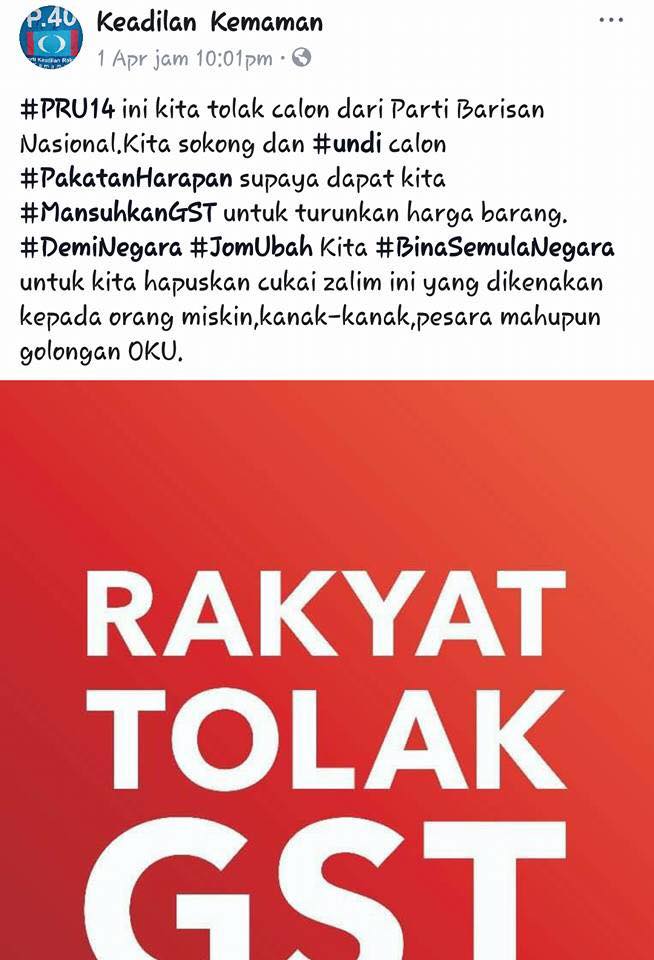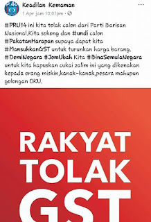 #PRU14 ini kita tolak calon dari Parti Barisan Nasional. Kita sokong dan #undi calon #PH supaya dapat kita #MansuhkanGST untuk turunkan harga barang.