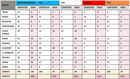 Jadual di atas oleh think tank ZIL menunjukkan DAP menyapu bersih kerusi DUN yang ditandinginya di Pulau Pinang (19), Perak (18), Selangor (14), Negeri Sembilan (11) dan Melaka (8). Negeri-negeri yang tersenarai ini mempunyai jumlah pengundi Cina yang menonjol.