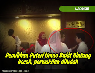 Mesyuarat dan Pemilihan Puteri Umno Bahagian Bukit Bintang dicemari dengan insiden pergaduhan antara beberapa anggota Puteri dan Wanita Umno di Pusat Dagangan Dunia Putra (PWTC), di Kuala Lumpur, hari ini.