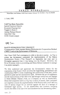 7. Ketika itu dilaporkan Projek Bakun melibatkan kawasan hampir seluas Singapura, tidak kurang dari 10,000 orang kaum Penan terlibat dengan perpindahan. Ekran milik Ting Pek Khiing diberi kontrak tanpa tender. Pacific Chemical milik Ting diberikan hak membalak 20K hektar, FCW dijanjikan kontrak kabel RM4 bil. Julai 1998 PM masa tu arah Anwar masih Menteri Kewangan mendapat arahan bayar pada Ting RM120 juta dari sejumlah RM2.2 bil yang di tuntut , tanpa ikut prosedur Kewangan. Sehingga 1997 sejumlah RM1.6 bil ganti rugi dibayar termasuk RM400 juta kontak terowong pada Dong Ah Korea dan RM1 bil pembelian turbines. Antara kontraktor asing terlibat - ABB ,CBPO Brazil,Lehmeyer Jerman, Harza USA , IMPSA Argentina, Alstorm. 1977 ABB dibayar ganti rugi USD 100 juta. 1999 TNB diarah ambil alih dimana pampasan USD250 juta dibayar lagi pada Ekran. KWSP, KWAP di jadikan sasaran.