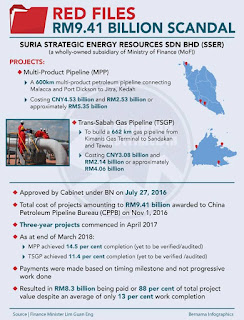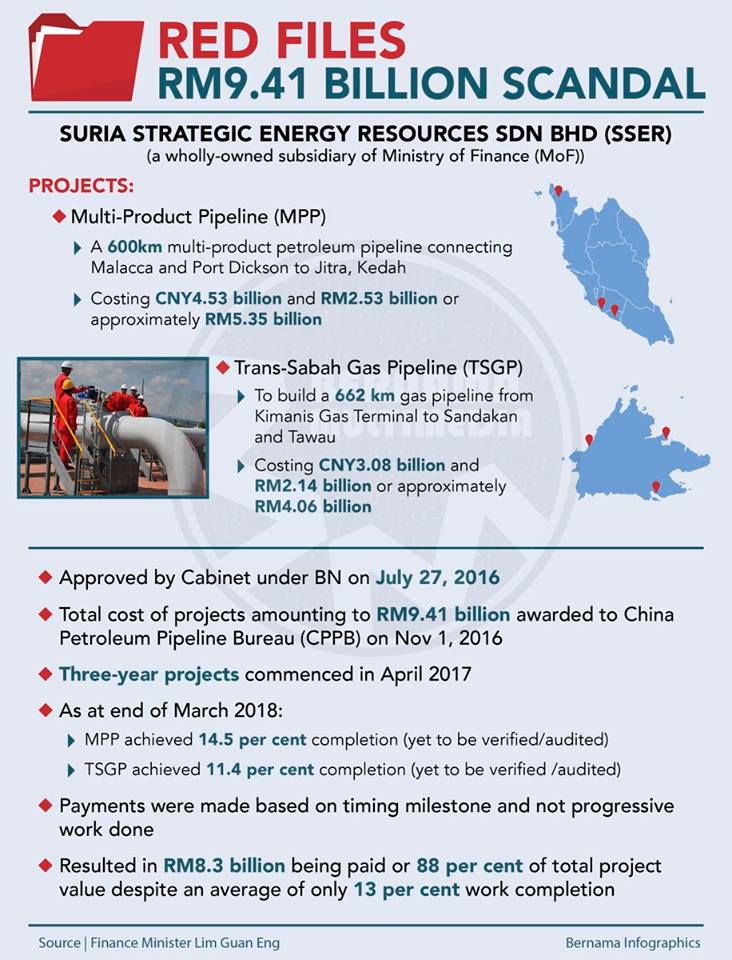 Menteri Kewangan, Lim Guan Eng, berkata skandal itu membabitkan syarikat Suria Strategic Energy Resources Sdn Bhd (SSER) yang mana sudah membayar 88 peratus atau RM8.3 bilion walaupun hanya 13 peratus kerja yang sudah siap dilakukan.