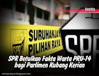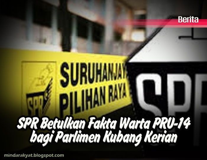 SURUHANJAYA Pilihan Raya (SPR) hari ini membetulkan fakta melalui warta Pilihan Raya Umum Ke-14 (PRU-14) yang menyaksikan lebihan 20,000 undi bagi kerusi Parlimen Kubang Kerian.