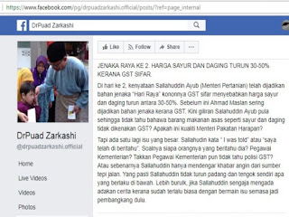 “Soalnya siapa orangnya yang beritahu dia? Pegawai kementerian? Takkan pegawai kementerian pun tidak tahu polisi GST? Atau sebenarnya Salahuddin hanya mendengar khabar angin daripada sumber tepi jalan,” tulisnya dalam ruangan posting di Facebooknya, DrPuad Zarkashi.