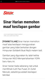 Sinar Harian telah menarik balik artikel tersebut di Sinar Online sebaik menyedari kesilapan tersebut dan membetulkan gambar berkaitan.