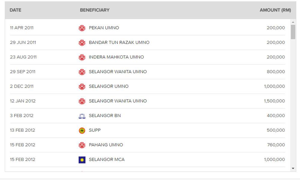Secara keseluruhannya, sekurang-kurangnya RM470 juta disalurkan ke pelbagai entiti politik melalui 102 transaksi, tidak termasuk bayaran kepada individu, antara April 2012 dan Ogos 2013.