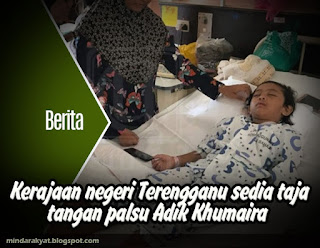 “Kerajaan Negeri Terengganu berbesar hati bersetuju untuk menaja tangan palsu buat Adik Khumaira,” ujar Menteri Besar, Dr Ahmad Samsuri Mokhtar menerusi laman sosial Facebook beliau, pagi ini..