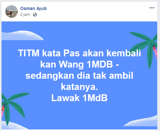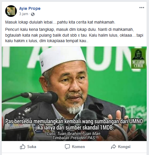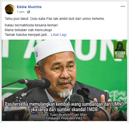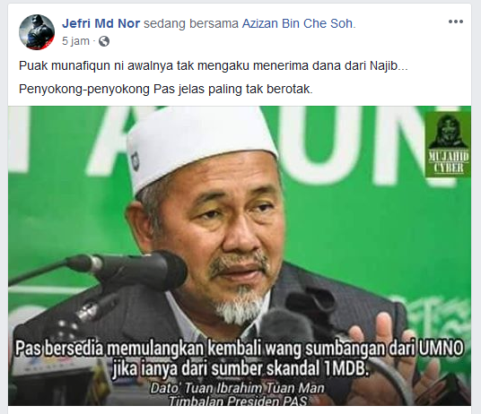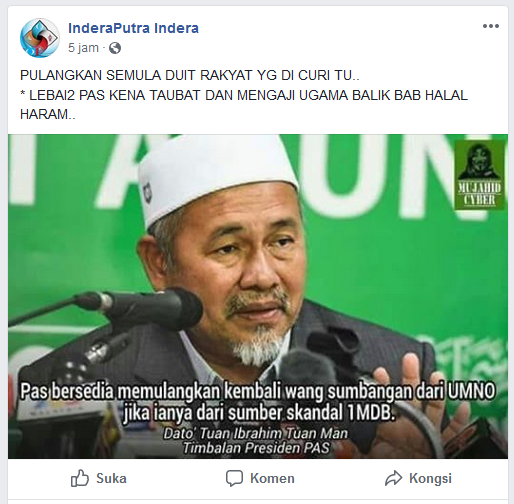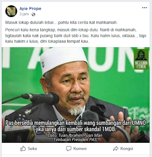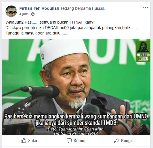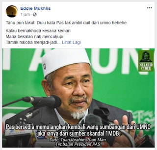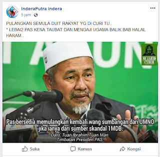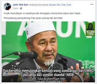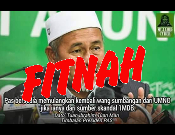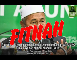 Sebaran terbaru fitnah kepada Tuan Ibrahim kononnya TITM berkata PAS akan mengembalikan sumbangan UMNO jika ianya bersumberkan wang 1MDB. Agaknya apa mereka yang dikatakan solat setiap hari ini nak jawab di sisi ALLAH?