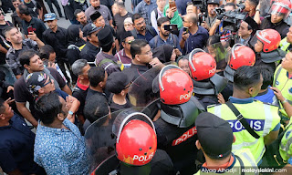 Beliau dan penyokong cuba berarak ke parlimen, ketika Agong bertitah hari ini, tetapi dihalang oleh polis.