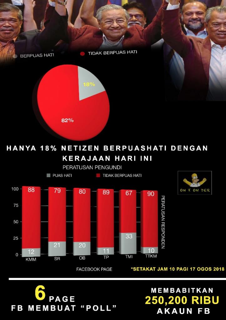 Menjelang 100 hari pentadbiran kerajaan baharu di bawah Pakatan Harapan tempoh hari, banyak page di Facebook yang membuat undian untuk mengukur tahap kepuasan dan kegembiraan rakyat di alam maya atau netizen terhadap 100 hari pemerintahan kerajaan Malaysia hari ini. Hasil undian ini, rata-rata majoriti netizen tidaklah begitu gembira dan tidak berpuas hati dengan pemerintahan kerajaan hari ini selepas 100 hari.