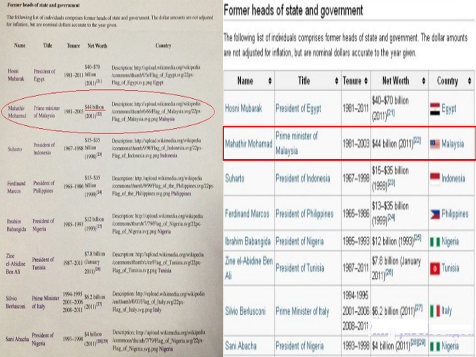 Walau bagaimanapun, laman Wikipedia yang masih boleh dilayari di Malaysia, nama Mahathir dengan misterinya telah dipadam pada hari Isnin 17 Disember 2012 beberapa minit selepas Malaysia Chronicle menyiarkan berita Mahathir now the world's second richest ex-leader with US$ 44 BILLION? (Mahathir sekarang bekas pemimpin kedua terkaya dengan harta sejumlah US$ 44 Billion?). Pembaca boleh rujuk pada versi bergambar laman web dimana nama Mahathir disenaraikan dengan jelas selepas Mubarak dan bandingkan ia dengan versi seperti di pautan.