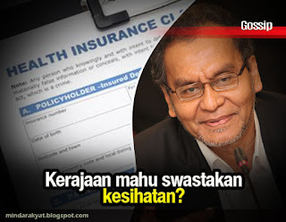 “We are thinking of minimum coverage of between RM10,000 and RM20,000 per family with annual premium of below RM1,000. That is something workable,” he said, adding that the government would subsidise those who could not afford the premium.“For those who feel the coverage amount is not enough, they can still top up on their own or even buy private health insurance,” he noted.Dr Lee said if everyone is covered by insurance, hospitals can charge according to cost.Ini adalah sesuatu cara di mana kerajaan menswastakan kos penjagaan kesihatan (healthcare). Dan ini adalah masih tahap market testing. Sebenarnya, saya faham bahawa insurans ini akan membantu rakyat dengan membayar kos hospital dan perubatan, namun mereka terpaksa membayar RM1,000 setahun.