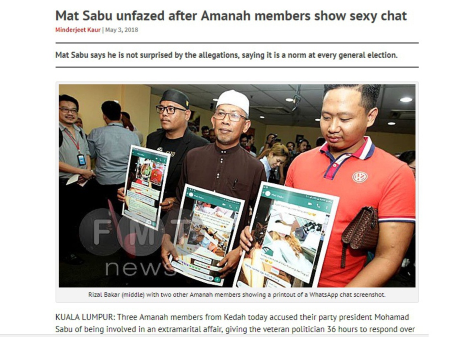 Pada 4 Mei 2018 Presiden Parti Amanah Negara (AMANAH), Mohamad Sabu menyatakan bahawa beliau akan mengambil tindakan undang-undang terhadap tiga lelaki yang menuduhnya melakukan hubungan luar nikah dengan seorang wanita.