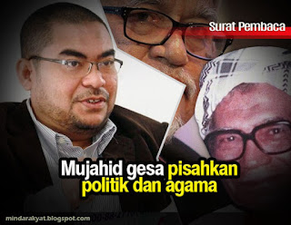 Tiba2 si mujahid ni nk suruh pisahkan agama dan politik... sudah panas punggung kah mujahid???...dan fahaman atau pegangan utk memisahkan agama dan politik ini lah yg telah disebut oleh almarhum TGNA sebagai "politik suku agama suku"...bila buat urusan politik, agama simpan dalam poket...ertinya apa saja yg diputuskan tak libat dgn dosa dan pahala...bila nk sembahyang, baru ambik balik agama tu guna...