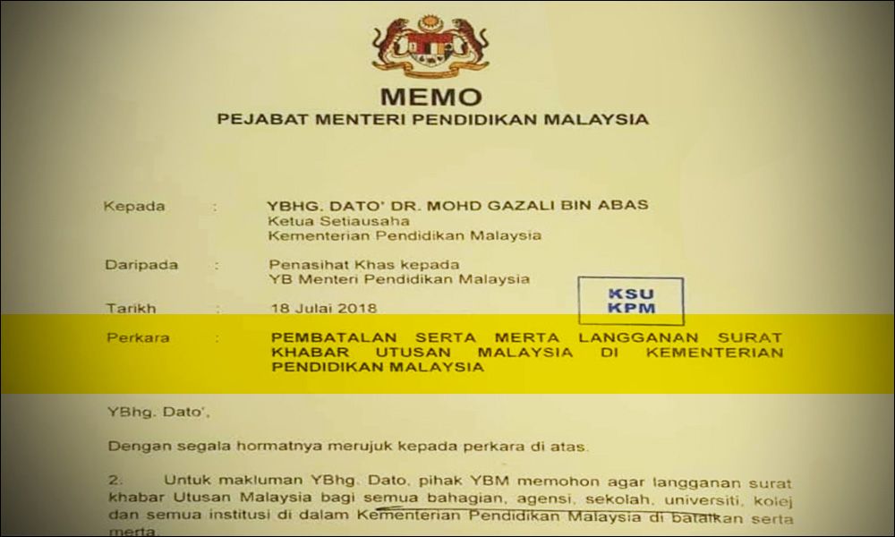 "Untuk makluman, menteri pendidikan memohon agar langganan suratkhabar Utusan Malaysia bagi semua bahagian, agensi, sekolah, universiti, kolej, dan semua institusi di dalam Kementerian Pendidikan Malaysia dibatalkan serta-merta," kata memo berkenaan.