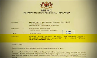 Memo bertarikh 18 Julai itu ditujukan kepada Ketua Setiausaha Kementerian Pendidikan Malaysia Datuk Mohd Ghazali Abas.