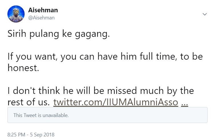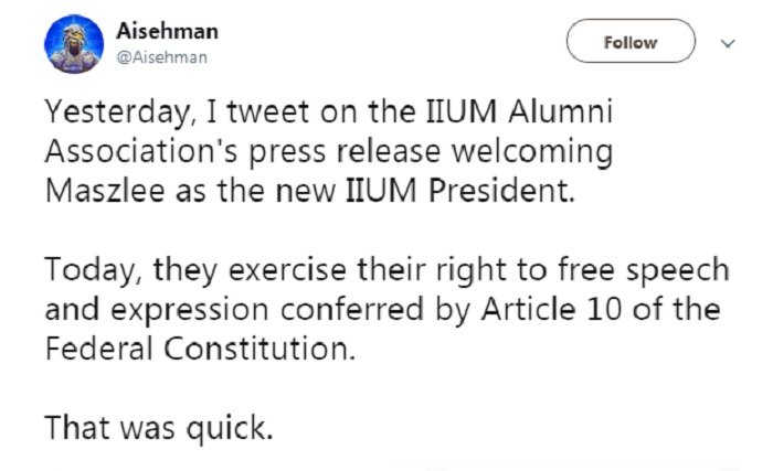 Kesal dengan tindak balas aniaya itu, Aisehman membuat kicauan balas dengan hantaran berbunyi: “Semalam saya kicau kenyataan akhbar Persatuan Alumni UIAM yang mengalu-alukan Maszlee sebagai Presiden UIAM baharu.