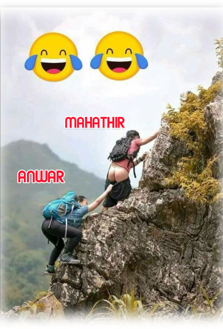 Anwar pula sambil bergantung dengan Mahathir sambil dia lodehkan salahlaku Mahathir macam dalam gambar di atas. Dia nak jadi PM, dia nak Mahathir tolong dia, tapi dia tersilap bergantung.