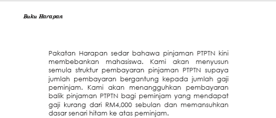 Pakatan Harapan cuba dan telah memperbodohkan Rakyat Malaysia. Mereka meletakkan otak Rakyat Malaysia di lutut kaki mereka. Sudah jelas di dalam manifestomato mereka janji hendak menstrukturkan semula hutang PTPTN. Kenapa sekarang PAS dan DS Najib menjadi kambing hitam untuk dipersalahkan. Bodoh sangatkah penyokong Pakatan Harapan ini?