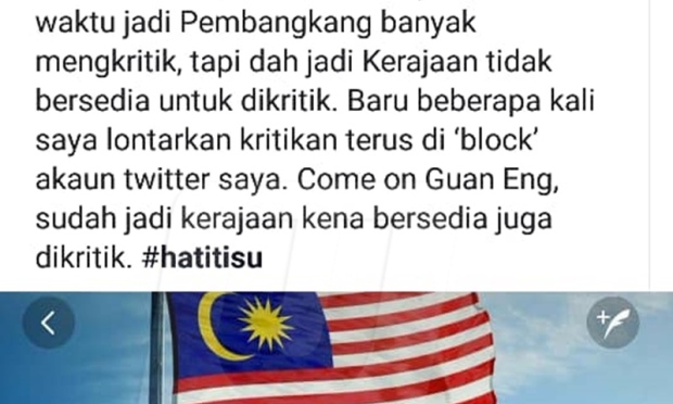 “Baru beberapa kali saya lontarkan kritikan terus di ‘block’ akaun Twitter saya. Come on Guan Eng, sudah jadi kerajaan kena bersedia juga dikritik,” katanya dalam satu kenyataan di akaun Facebooknya di sini hari ini.