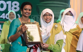 KUALA TERENGGANU 14 Sept. - Ketua Wanita Dewan Himpunan Penyokong Pas (DHPP), R.Kumutha, 39, menerima penghargaan sebagai Wanita Cekal Pas dalam Muktamar Tahunan Dewan Muslimat Pas di Dewan Konvensyen, Taman Tamadun Islam (TTI) di sini hari ini.