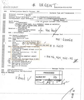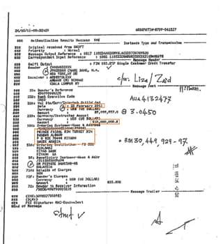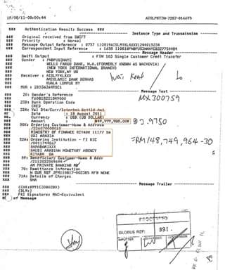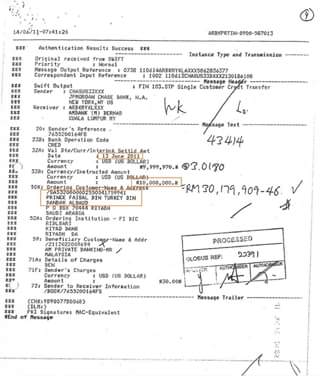 Dokumen pemindahan wang SWIFT bagi tahun 2011 menunjukkan yang US$20 juta dipindahkan daripada akaun Putera Faisal bin Turkey bin Al Saud dan US$80 juta dipindahkan daripada akaun Kementerian Kewangan Arab Saudi kepada saya.