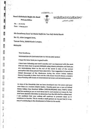 Pada 1 Februari 2011, Putera Abdulaziz Al-Saud menulis kepada saya, memberitahu bahawa Arab Saudi akan menyediakan US$100 juta (RM415 juta) kepada saya bagi tahun 2011.