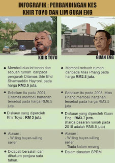 Manakala dalam kes Lim Guan Eng, bekas Ketua Menteri Pulau Pinang bukan sahaja tahu harga rumah beliau lebih tinggi dari harga pasaran, malah penjual juga mendapat faedah daripada kerajaan negeri.