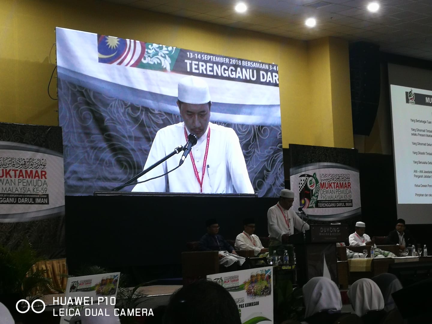 1. Alhamdulillah, dengan izin dan perkenan Allah S.W.T jua, kita dapat berhimpun sekali lagi dalam Muktamar Ke-59 Dewan Pemuda PAS dan kali ini di Negeri Terengganu Darul Iman selaku tuan rumah - tepat dengan kemenangan yang Allah anugerahkan dan sekali gus amanahkan kepada kita dalam PRU Ke-14 lalu. InsyaAllah berkat izin Allah dan sokongan padu seluruh pendukung PAS, kita akan pimpin Terengganu sekali lagi, sebagaimana di Kelantan, atas dasar Islam dan pendekatan Politik Matang dan Sejahtera yang sudah kita sepakati.