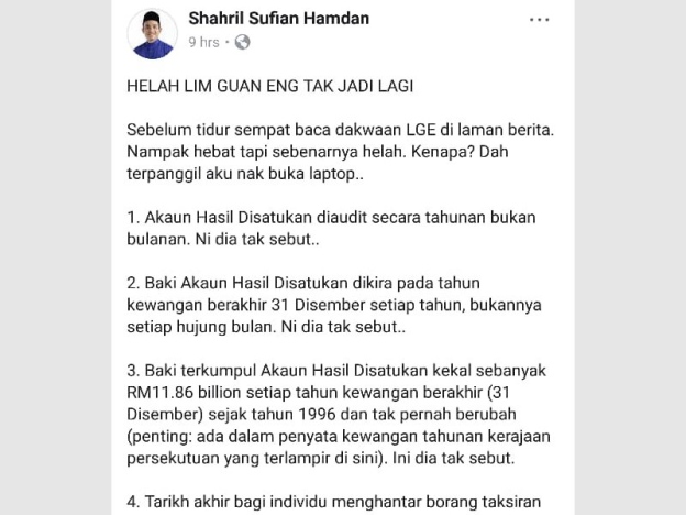 Shahril berkata, Guan Eng tidak menyebut bahawa Akaun Hasil Disatukan diaudit secara tahunan dan bukan bulanan