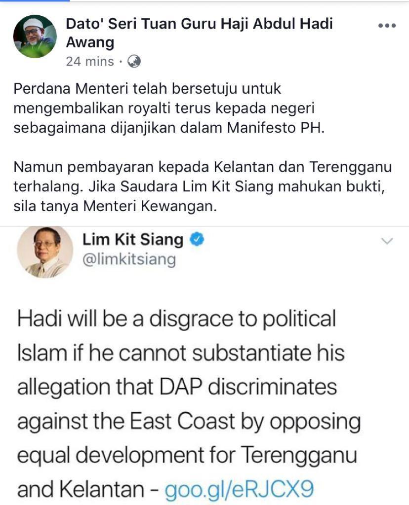 “Namun pembayaran kepada Kelantan dan Terengganu terhalang. Jika saudara Lim mahukan bukti, sila tanya menteri kewangan,” katanya di Facebook.