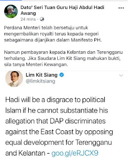 Lim semalam mendesak Hadi untuk membuktikan diskriminasi DAP terhadap pantai timur Semenanjung dengan tidak menyokong pembangunan saksama di Kelantan dan Terengganu.