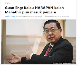 Malaysiakini menyiarkan Menteri Kewangan, Lim Guan Eng tidak menolak kemungkinan Tun Dr Mahathir Mohamad disumbat ke penjara sekiranya Pakatan Harapan (HARAPAN) tewas dalam pilihan raya umum (PRU) ke-14 yang lalu.