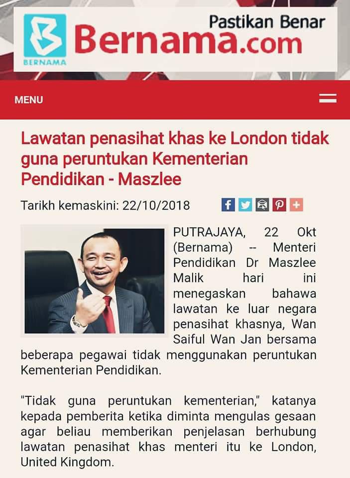 Menteri Pendidikan, Dr Maszlee Malik cuba memperbodohkan Rakyat apabila beliau menegaskan bahawa lawatan Penasihat Khas beliau, Wan Saiful Wan Jan ke Luar Negara bersama rombongannya tidak menggunakan peruntukan Kementerian Pendidikan.