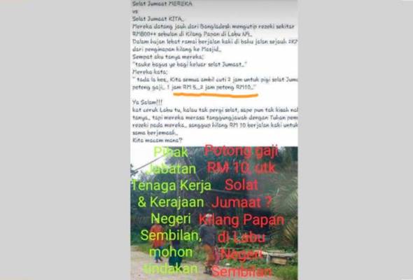 Jabatan Tenaga Kerja (JTK) Negeri Sembilan akan menyiasat kenyataan tular di media sosial mengenai pekerja Bangladesh sebuah kilang di Labu di sini, yang dikatakan terpaksa mengambil ‘cuti’ dua jam bagi menunaikan solat Jumaat.