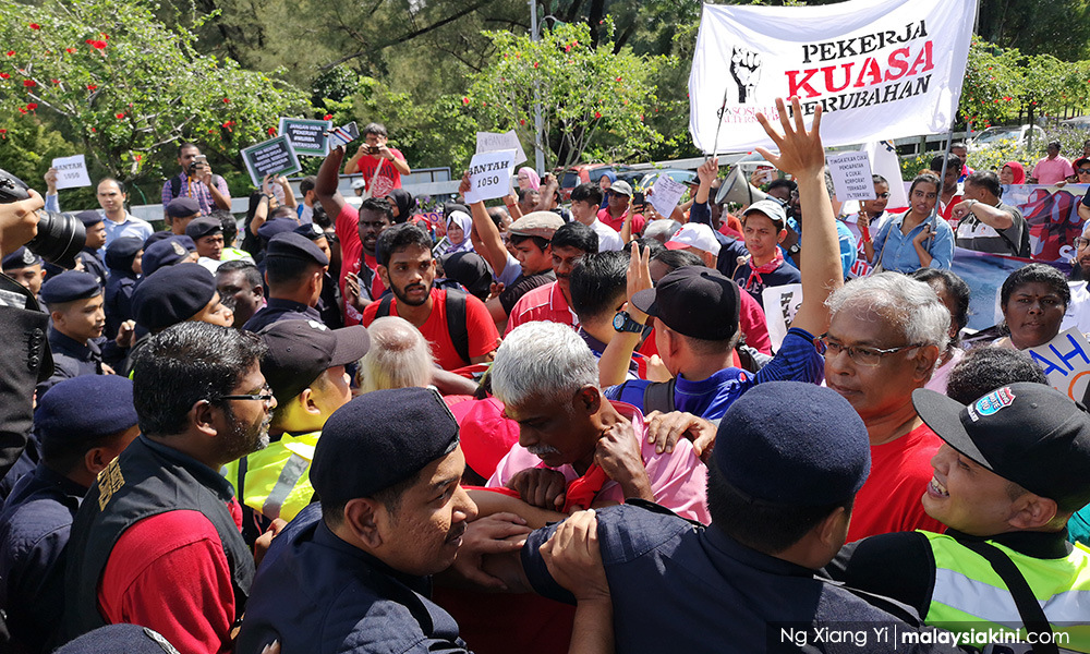 Protes anjuran Kongres Kesatuan Sekerja Malaysia (MTUC) itu mendesak kerajaan mengkaji semula penyeragaman gaji minimum sebanyak RM1,050 sebulan, yang akan berkuat kuasa bermula Januari tahun depan.