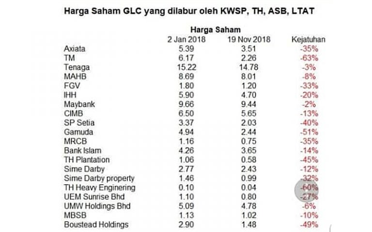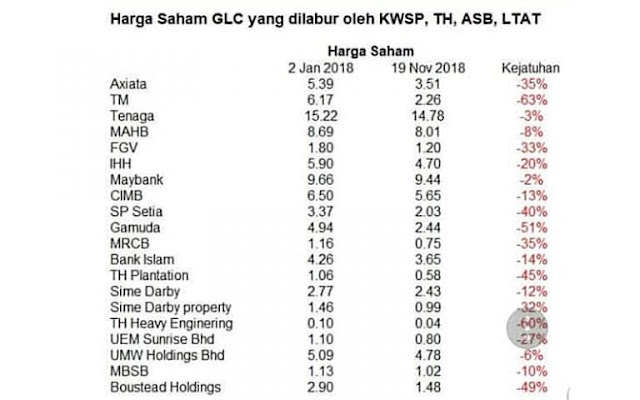 “Berdasarkan jumlah saham yang dipegang mereka, kejatuhan harga saham Telekom Malaysia sahaja menyebabkan Khazanah rugi RM3.9 bilion, KWSP rugi RM2.5 bilion dan ASB (Amanah Saham Bumiputera) rugi RM1.8 bilion berbanding sebelum PRU14.