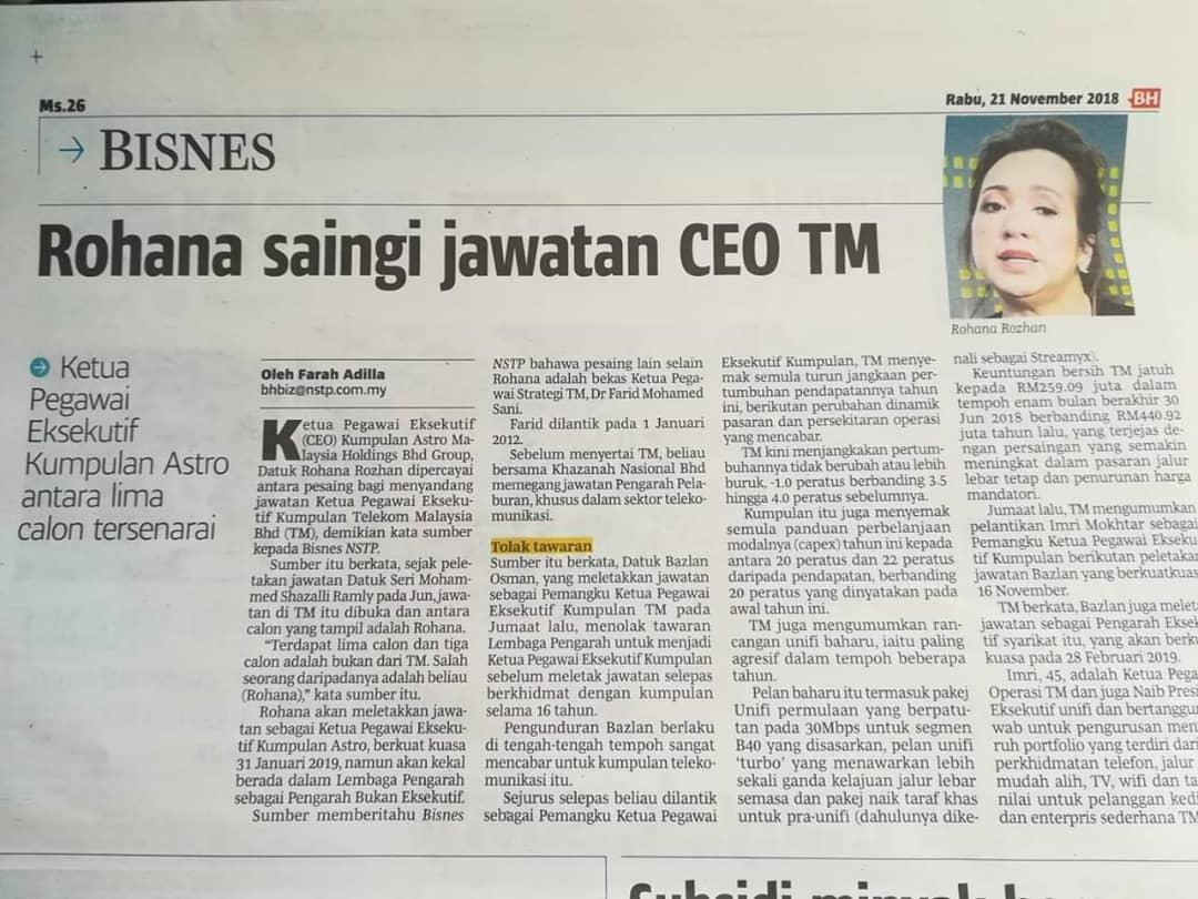 Apa ada di sebalik desakan Gobind ini. En Gobind di lihat hampir setiap hari nak mencari salah TM. Boleh google “Gobind Singh and TM”. Terkini ada berita bekas CEO A”xx”o hendak mengejar jawatan CEO TM. Saya lihat mungkin ada satu sudut kepentingan pada syarikat competitor terbesar TM. Jika di lihat perbandingan sistem pemancar satelit (satu hala sahaja) kurang efektif berbandingan fiber yang lebih pantas dan boleh dua hala. Syarikat tersebut berangan angan memerlukan sistem dua hala, mengapa?