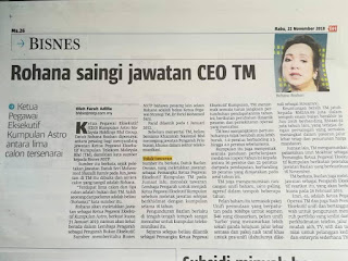 Di harap informasi ini akan dapat menyedarkan pihak lain supaya agenda jahat ini tak berlaku dan dapat di benteras. Jangan memusuhi TM, mereka dah bertungkus lumus, menyediakan prasarana untuk kegunaan rakyat dan berkorban untuk memudahkan semua pelanggan. Amat mudah untuk mencari salah pada satu Syarikat, sepatutnya syarikat lain mempunyai tanggungjawab yang sama. Takut takut agenda menjatuhkan TM berjaya, dan akan ada satu Syarikat akan monopoli telekomunikasi di Malaysia, dan bila ia berlaku Kerajaan dan rakyat akan kehilangan asset yang besar . Syarikat yang mengambil alih TM ini akan berkuasa menentukan harga tanpa ada yang boleh memberi alternatif. Semoga Allah membantu TM.