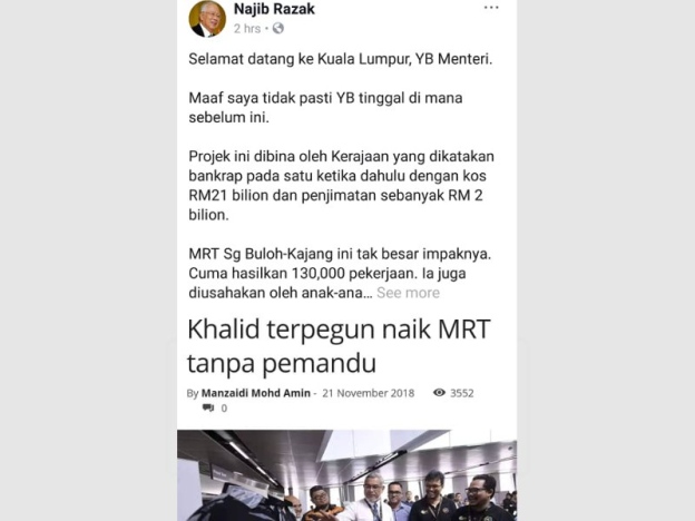 SHAH ALAM - Bekas Perdana Menteri, Datuk Seri Najib Tun Razak menyindir Khalid Abdul Samad selepas Menteri Wilayah Persekutuan itu dilaporkan media terpegun selepas menaiki pengangkutan awam Transit Aliran Massa (MRT).