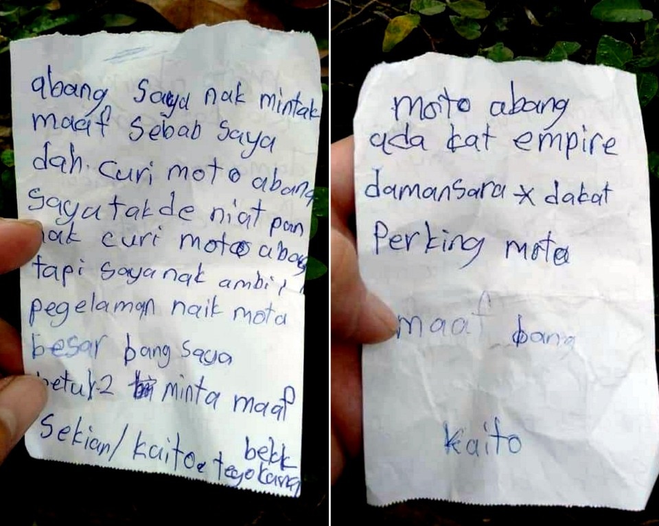 Permohonan maaf itu terkandung dalam nota ditulis seorang penjenayah kepada pemilik sebuah motosikal berkuasa tinggi selepas melarikan motosikal jenis Yamaha R6, dalam kejadian di pangsapuri Flora Damansara, semalam.